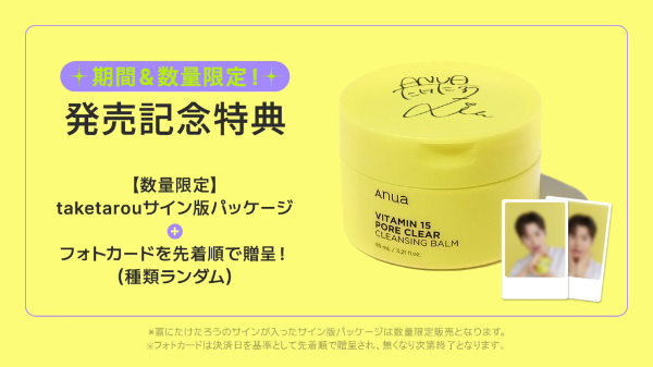 たけたろう×アヌア(ANUA)共同開発のビタミン15 ポアクリア クレンジングバームが発売されます。2024年2月16日(金)よりQOO10(キューテン)にて取扱い。共同開発を記念して2024年2月16日(金)〜18日(日)の3日間限定で特別セールが実施されます♪さらに数量限定でサイン版パッケージを数量限定販売、フォトカードを先着でプレゼント!お得な期間をお見逃しなく!