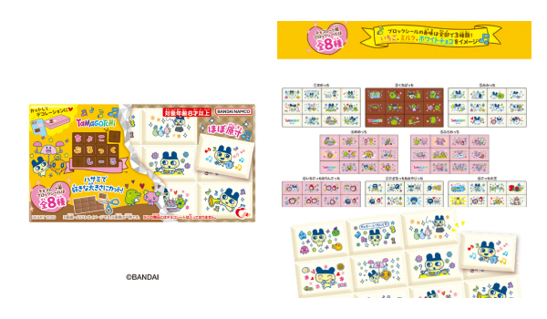 人気の「ちょこぶろっくしーる」シリーズに、たまごっちが仲間入り!板チョコレートをイメージしたデザインに、たまごっちたちの表情やしぐさがぎゅっと詰まっています。いちご、ミルク、ホワイトの3カラーは、それぞれの個性を引き立てる甘くてキュートな仕上がり。1シートには12柄がデザインされ、全8種のラインナップ。どれが出るかは開けてからのお楽しみです。