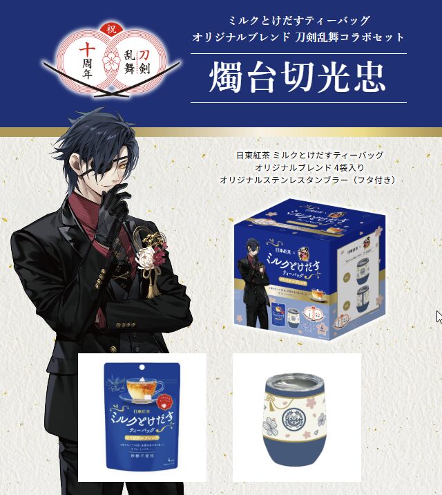 燭台切光忠くんの祝装デザインが、ついに日東紅茶のコラボグッズで手に入るなんて、嬉しすぎて泣きそうです!😭 しかも、紋入りのオリジナルステンレスタンブラー付きで、ミルクとけだすティーバッグ オリジナルブレンドが入っているなんて、まさに優雅なティータイムが楽しめますね。本州・四国エリアのイオンで12月9日から先行販売とのことですが、確実に手に入れたいので、日東紅茶TeaMartの12月10日からの予約受付に申し込みます!発送は2026年3月下旬と少し先ですが、楽しみに待ちたいと思います!