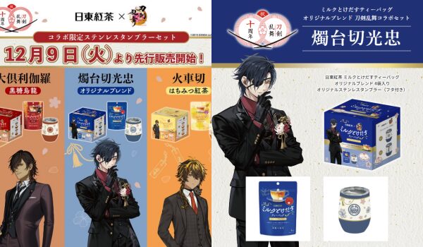 ・「刀剣乱舞ONLINE」と「日東紅茶」のオリジナルステンレスタンブラーセットが発売。 ・祝装の燭台切光忠、大倶利伽羅、火車切の3種がラインナップ。 ・本州・四国エリアのイオンで12/9先行販売、日東紅茶TeaMartで12/10より予約受付。