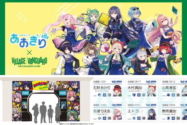 viviON所属VTuberグループ『あおぎり高校』とヴィレッジヴァンガードのコラボ展開に注目!全国対象の10店舗に等身大のスタンディーが登場しますので推しに会いにいってみては!?東京渋谷本店には大代真白、大阪梅田ロフトには春雨麗女が登場。あおぎり高校メンバーがヴィレヴァンスタッフエプロンを身に着けて、一生懸命働く描き下ろしビジュアルがすごく可愛いですね。