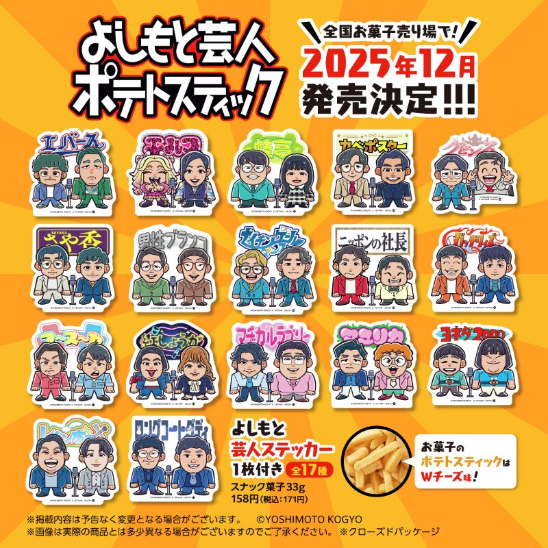 よしもと芸人のお菓子『よしもと芸人ポテトスティック』が登場🎉ダイカットステッカー全17組がラインナップし、ポテトスティックはWチーズ味でおいしさも満点。お笑いファン必見の限定グッズ付き食玩です♬