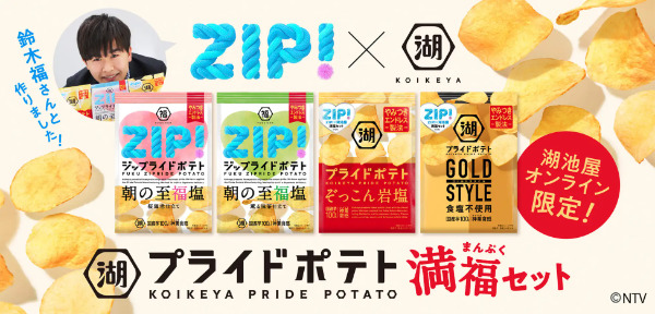 湖池屋×「ZIP!」コラボ!ZIPポテトチップスが登場♪Q.どこで売ってる?A.販売店は湖池屋オンライン通販限定。予約販売開始です。「プライドポテト満福セット」として「海老塩」「抹茶」「岩塩」「食塩不使用」の4種類、6袋セット!鈴木福さん考案のポテチに注目♪