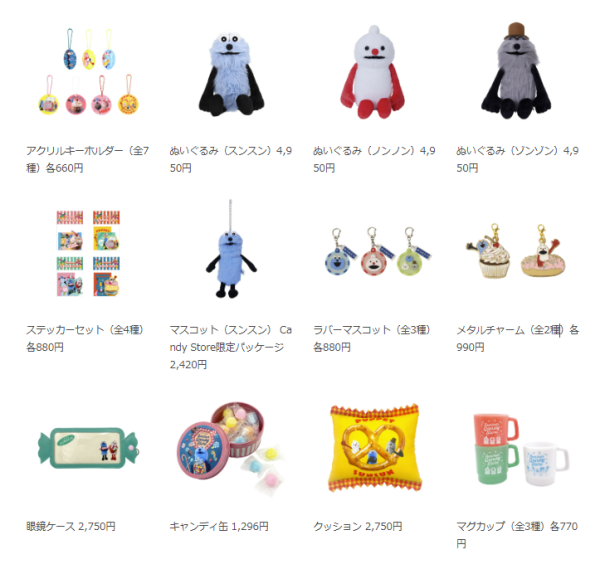 A.はい、ございます。今回のストアでは、スンスンの仲間であるノンノンとゾンゾンのぬいぐるみが今回初めて登場します。その他にも、Candyをテーマにした新アートを使用したアクリルキーホルダーやステッカー、マスコット(Candy Store限定パッケージ)など約80点のアイテムが販売されます。
