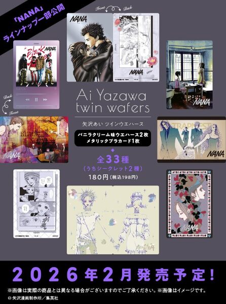 矢沢あい先生のツインウエハースが初登場なんて、これは事件💖 しかもNANAとパラキス、天ない、ご近所物語の豪華4作品ですよ!全33種類のカードはビジュが良すぎるに決まっています!裏面の漫画の印象的なコマも気になりすぎます。2026年2月の発売が待ち遠しい!