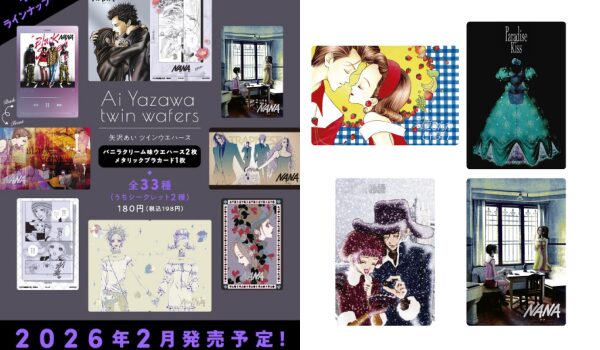 漫画家・矢沢あい先生の作品をテーマにした「矢沢あい ツインウエハース」が、2026年2月に全国の量販店の菓子売場等で発売されます。この商品は、矢沢あい先生の代表作である『NANA』、『Paradise Kiss(パラキス)』、『天使なんかじゃない(天ない)』、『ご近所物語』の豪華4作品のイラストや漫画のコマを収録したメタリックプラカード(全33種類、うちシークレット2種類)が付属します。カードはH約83mm × W約56mmのサイズで、裏面にも印象的なコマやイラストがデザインされています。お菓子はバニラクリーム味のウエハース2枚入りで、1個198円(税込)という手軽な価格で楽しめます。ただし、カードは1BOX(20個入)購入しても全種揃わない仕様となっており、コレクションの難易度は高めです。